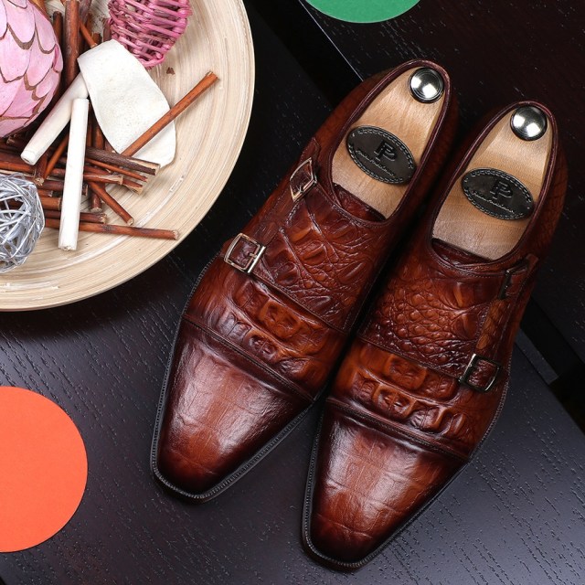 PAUL PARKMAN MEN’S BROWN CROCODILE EMBOSSED CALFSKIN DOUBLE MONKSTRAP