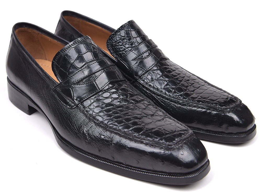 Paul Parkman Genuine Crocodile & Ostrich Penny Loafers Black