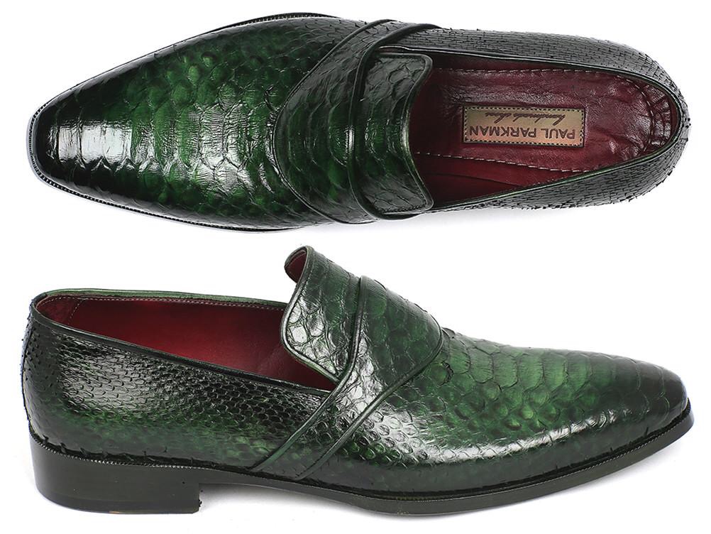 Paul Parkman genuine pythonskin loafers are polished to enhance the brightness of the excellent green tones.
