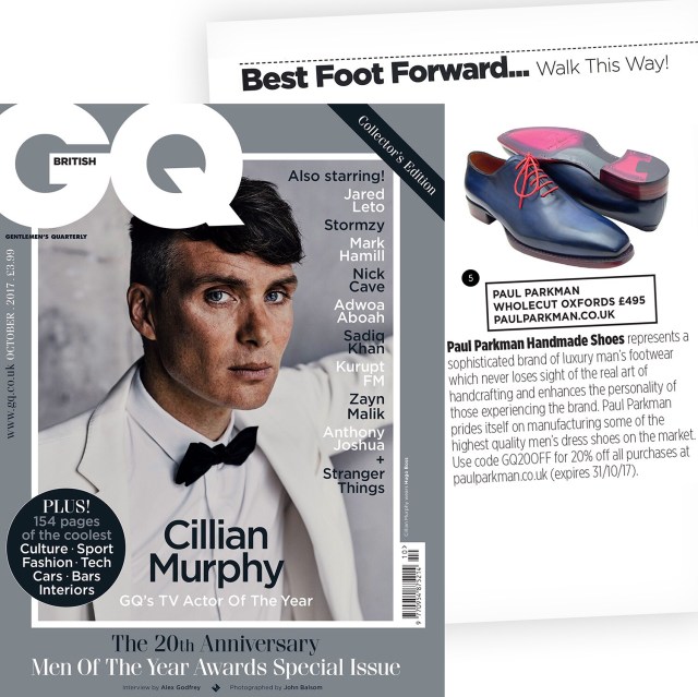 Best Foot Forward… Walk This Way ! ‘Paul Parkman Goodyear-Welted Blue Wholecut Oxfords’ @ GQ UK October 2017 issue