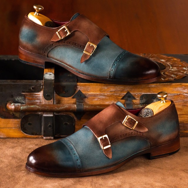 Paul Parkman Captoe Double Monkstrap Antique Blue & Brown Suede