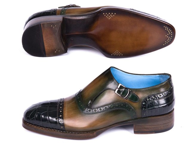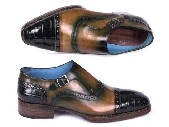 Paul Parkman Green Genuine Crocodile & Calfskin Captoe Monkstrap Shoes