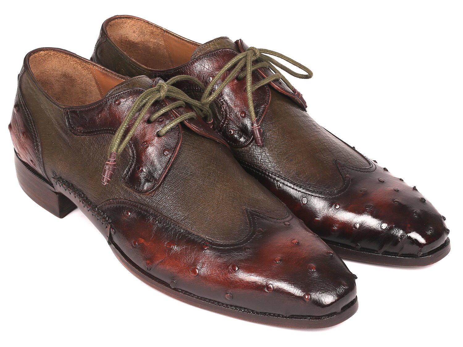 Paul Parkman Brown & Green Ostrich Skin Opanka Construction Wingtip Derby Shoes