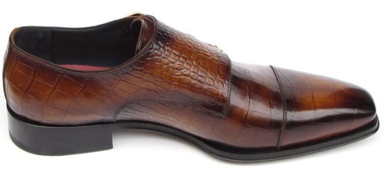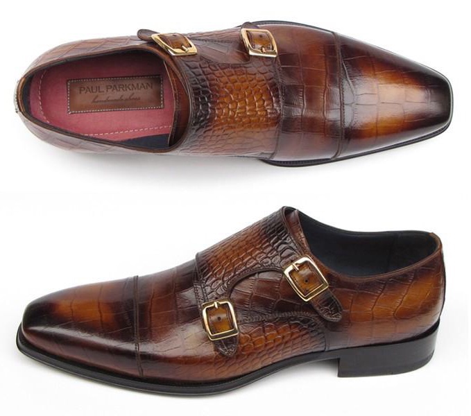 Paul Parkman Men’s Brown Burnished Hand-Painted Crocodile Embossed Calfskin Double Monkstrap