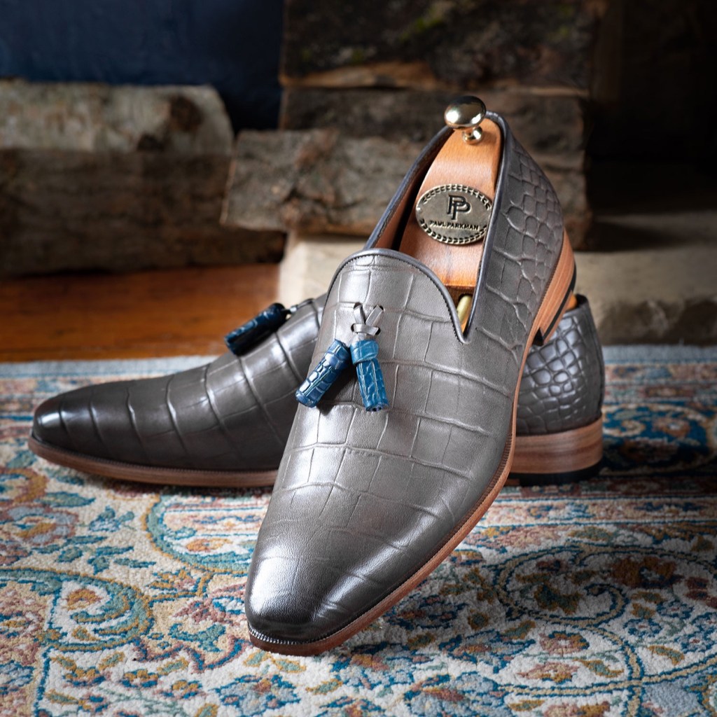 Paul Parkman Men’s Gray Crocodile Embossed Calfskin Tassel Loafer