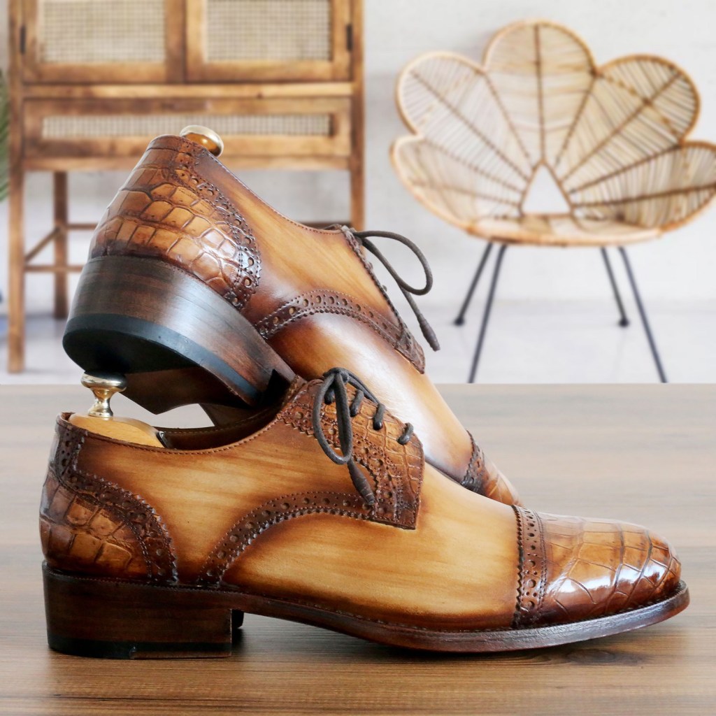 Paul Parkman Tan Brown Genuine Crocodile & Calfskin Cap Toe Derby Shoes