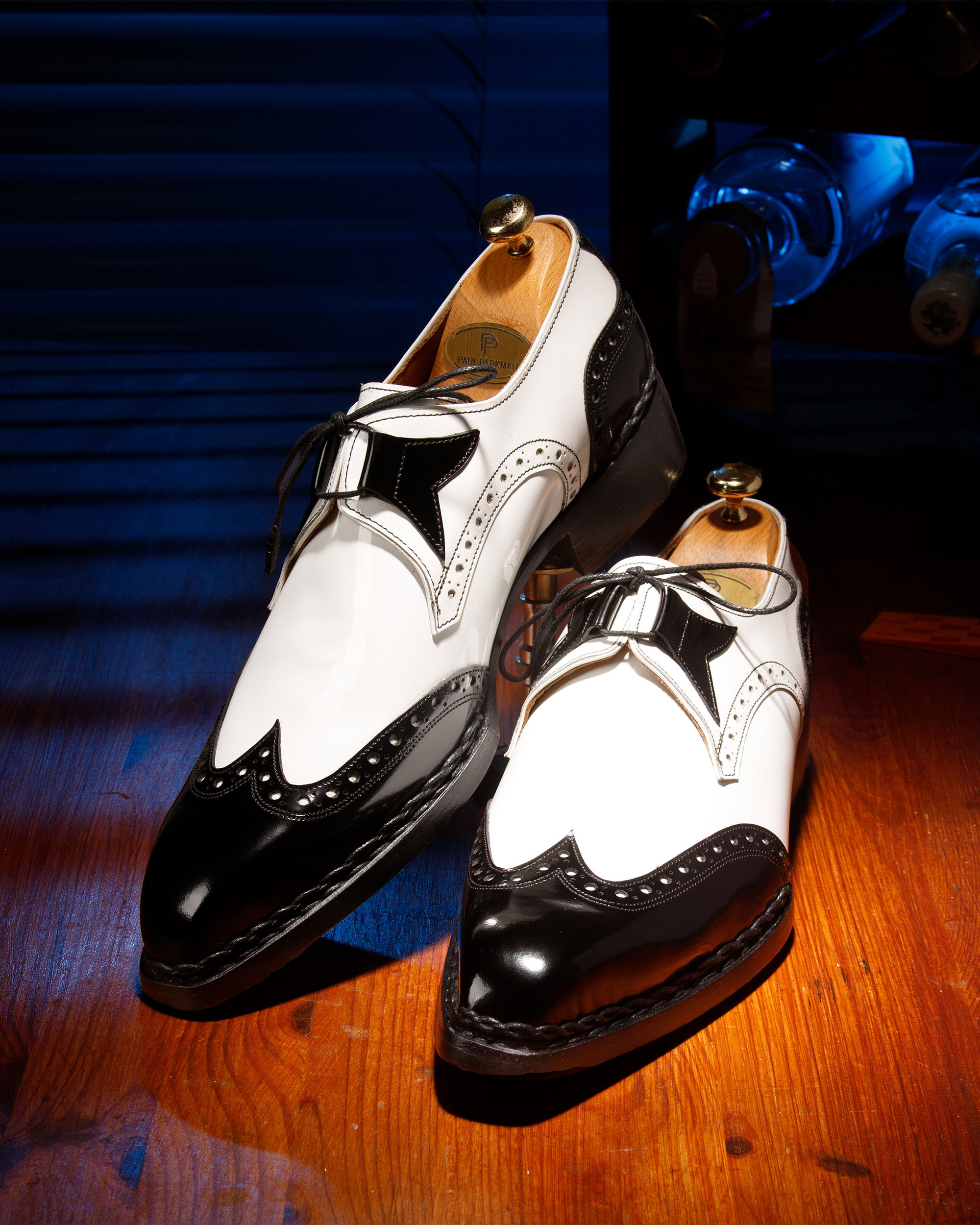 - Black polished leather and white patent leather upper.