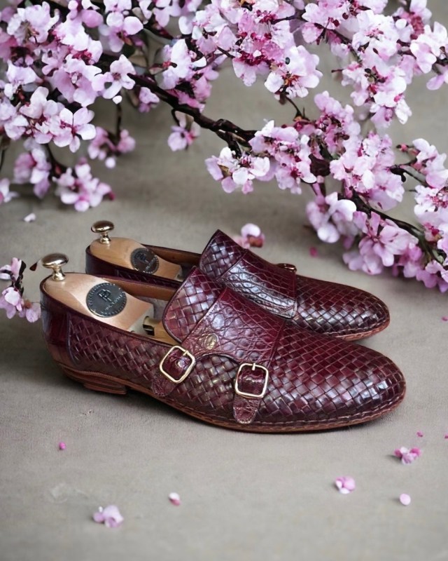 Paul Parkman Men’s Woven Leather & Crocodile Skin Handmade Opanka Construction Monkstrap Shoes