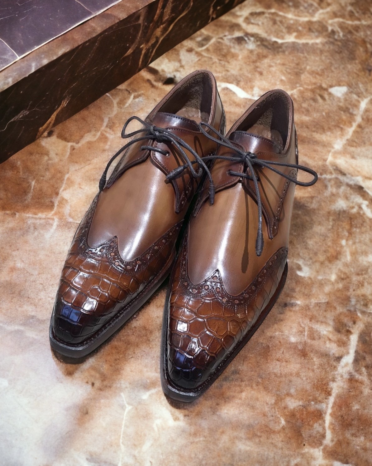 Paul Parkman Brown Genuine Crocodile & Leather Wingtip Derby Shoes for Men