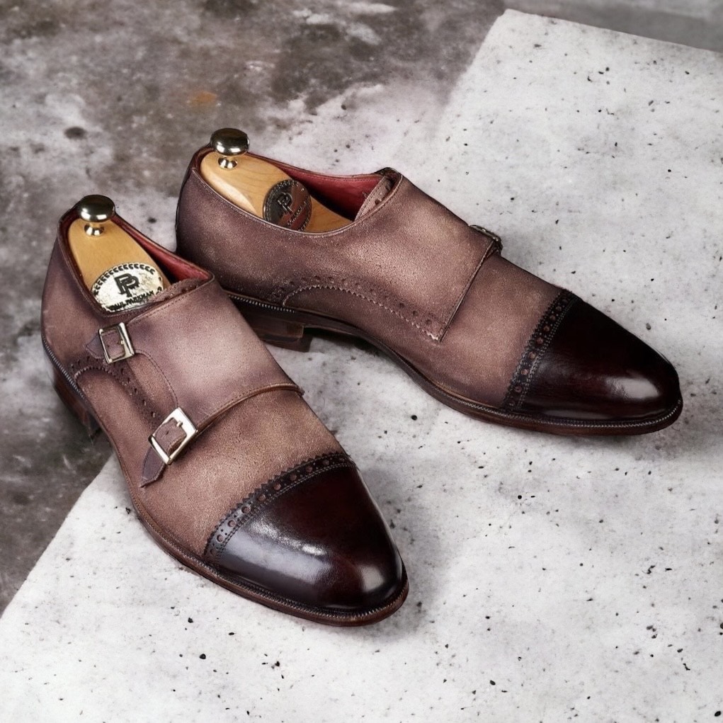 Paul Parkman Men’s Brown Antique Suede & Leather Cap Toe Double Monkstrap Shoes