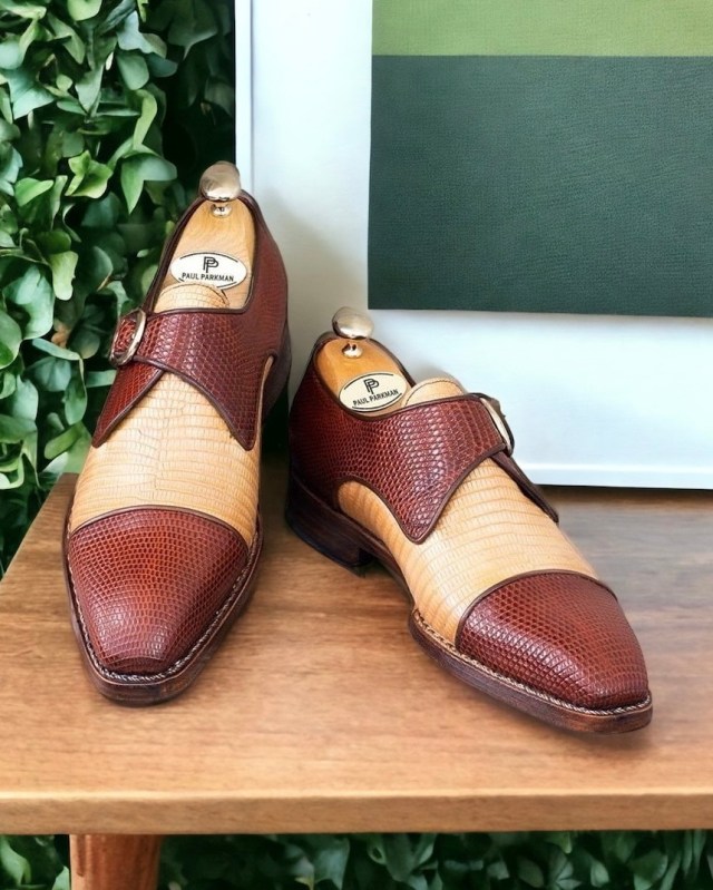 Paul Parkman Men’s Custom-Made Genuine Iguana Cap Toe Monkstrap Shoes Beige & Brown
