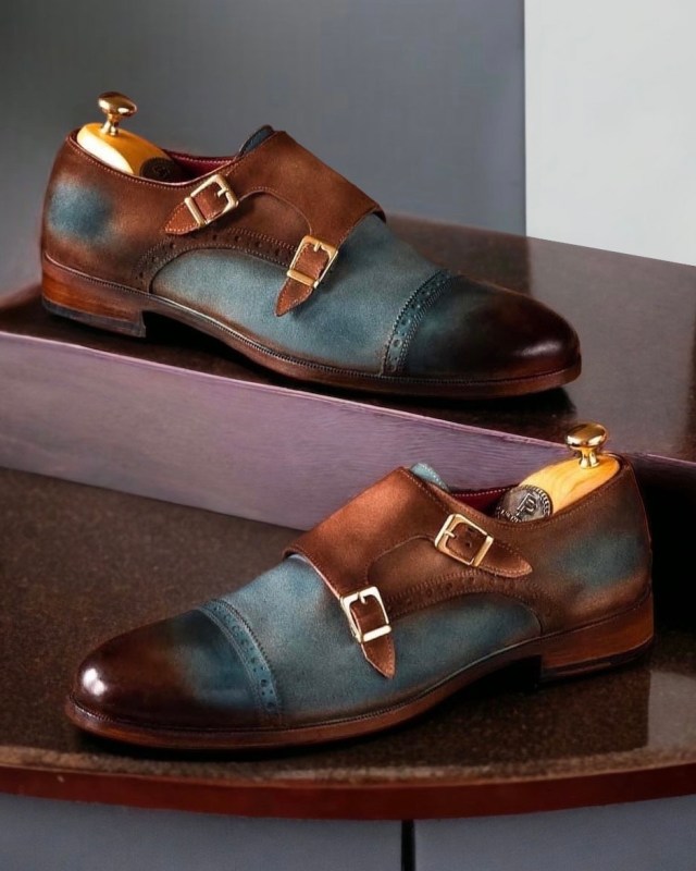 Paul Parkman Captoe Double Monkstrap Antique Blue & Brown Suede