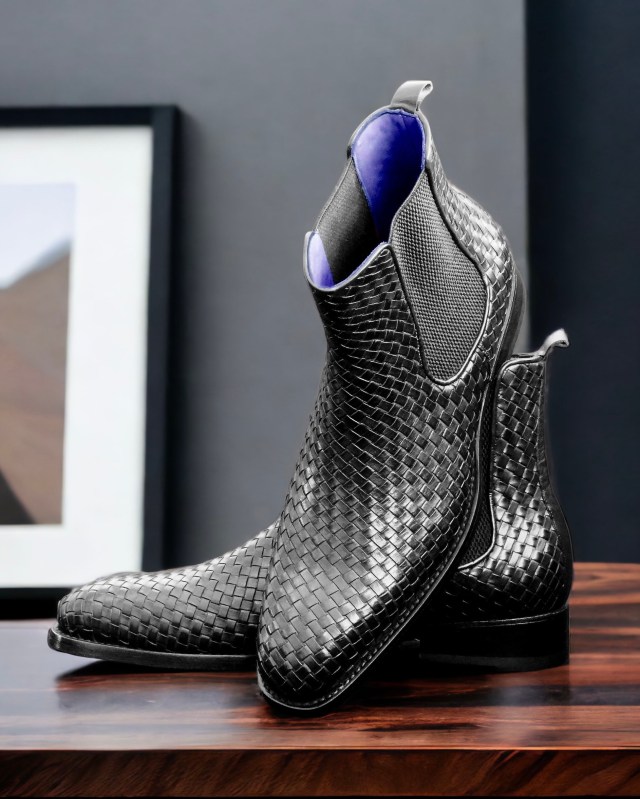 Paul Parkman Black Woven Leather Chelsea Boots