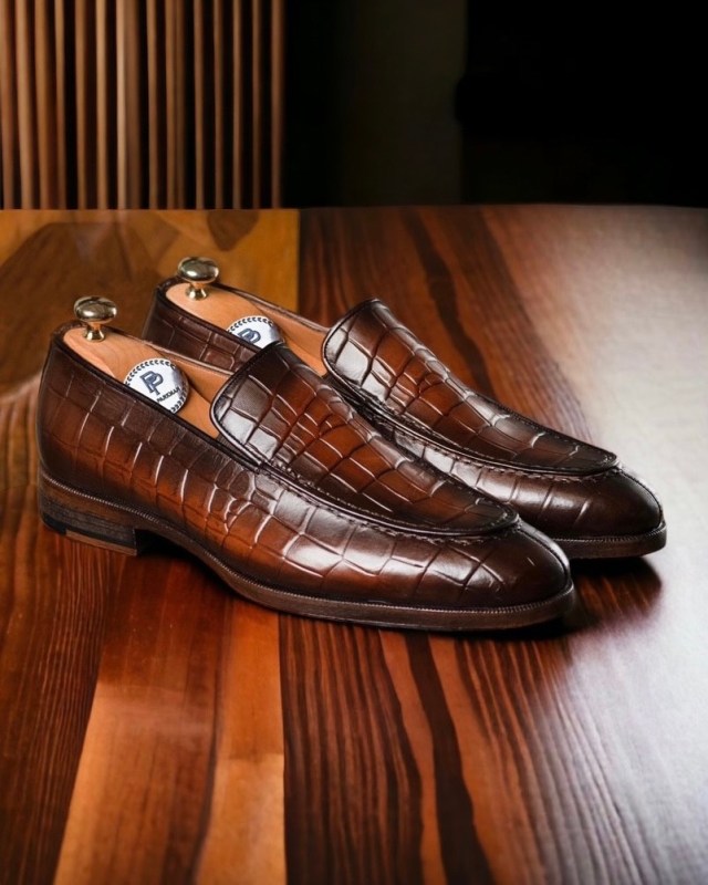 Paul Parkman Brown Burnished Crocodile Embossed Calfskin Loafer