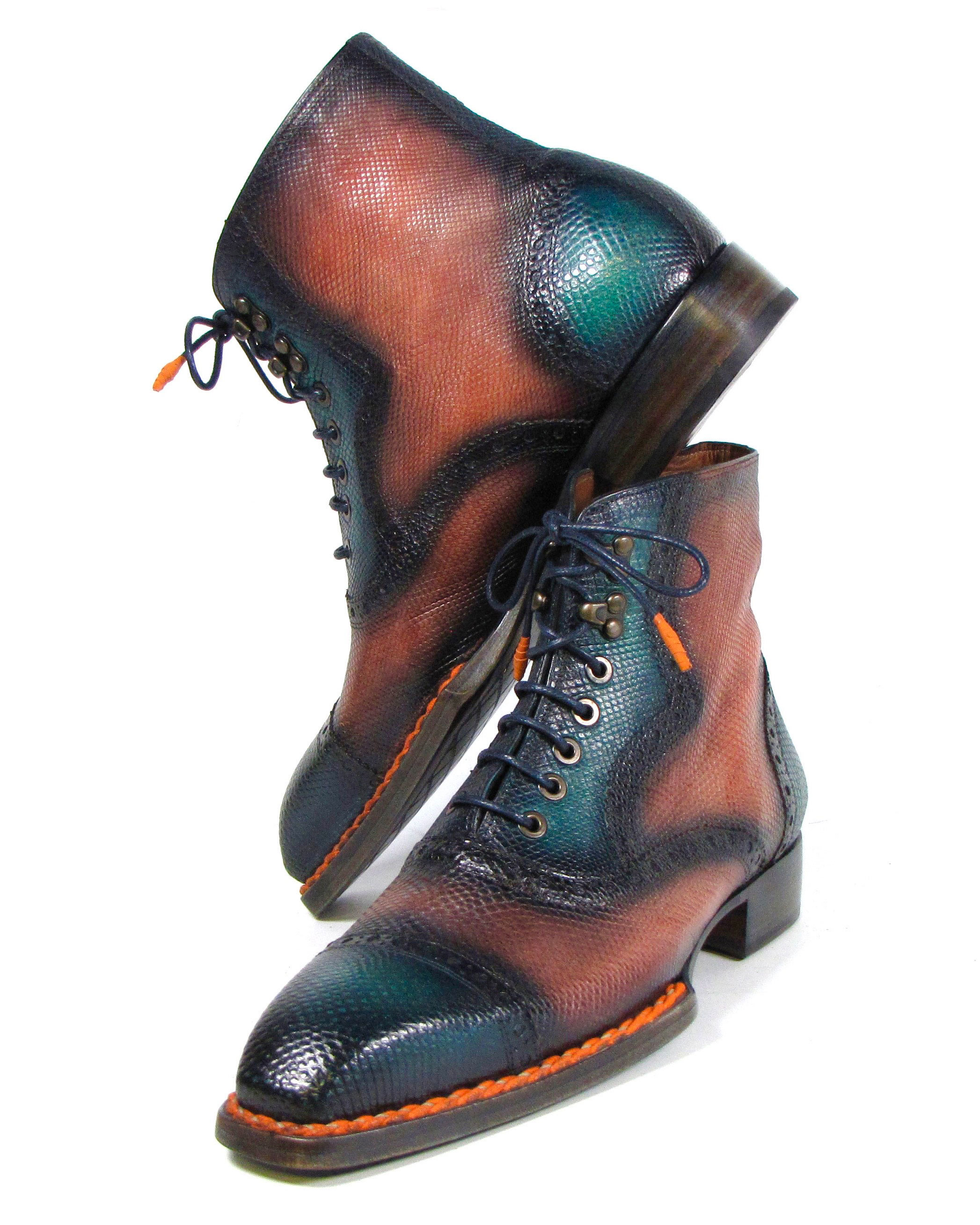 Paul Parkman Custom-Made Hand Welted Chain Stitched Green & Brown Karung Snake Skin Boots