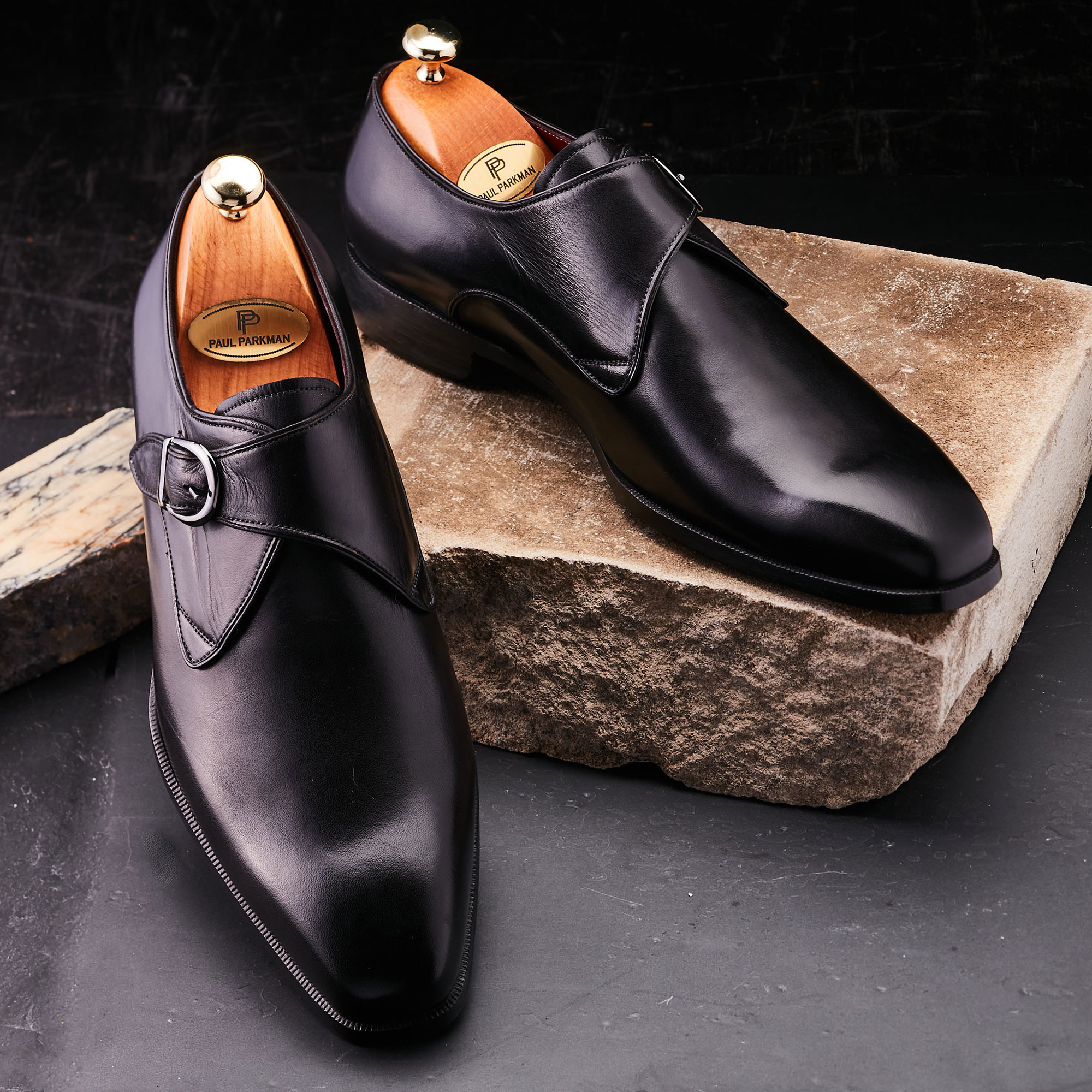 Paul Parkman Men’s Plain Toe Single Monkstrap Shoes Black Leather