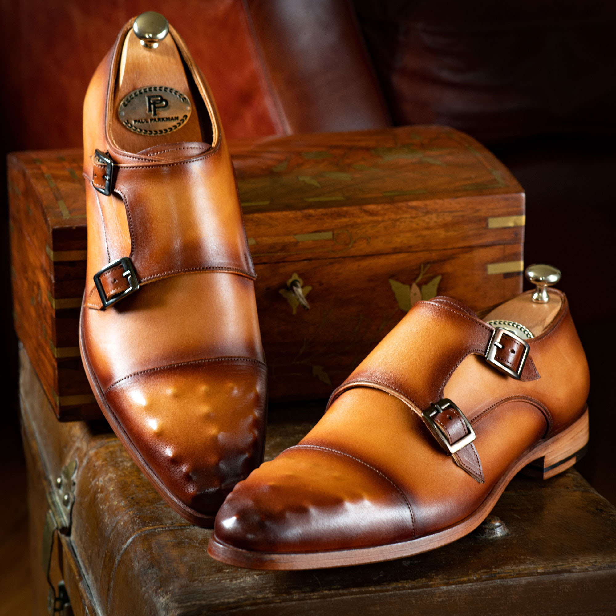 Paul Parkman Men’s Double Monkstrap Studded Cap Toe Shoes Tan Color