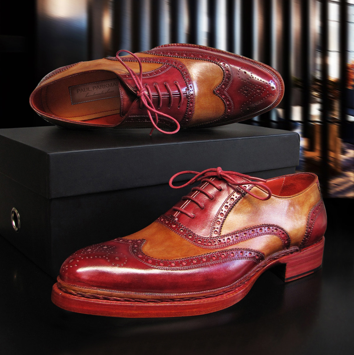 Paul Parkman Men’s Triple Leather Sole Wingtip Brogues Bordeaux & Camel