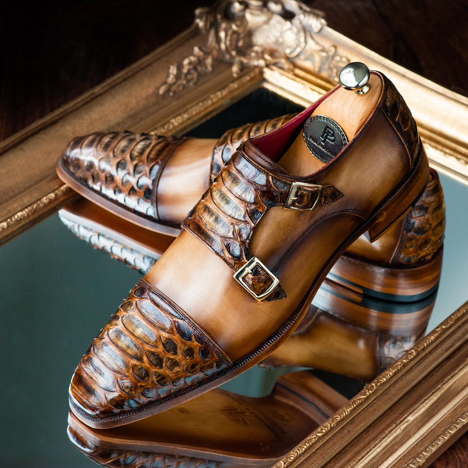 Paul Parkman Men’s Brown Python Skin Cap Toe Double Monkstrap Shoes