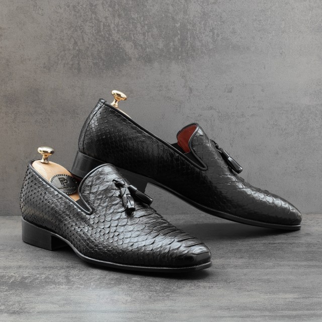 Paul Parkman Men’s Custom-Made Black Genuine Python Tassel Loafer Shoes