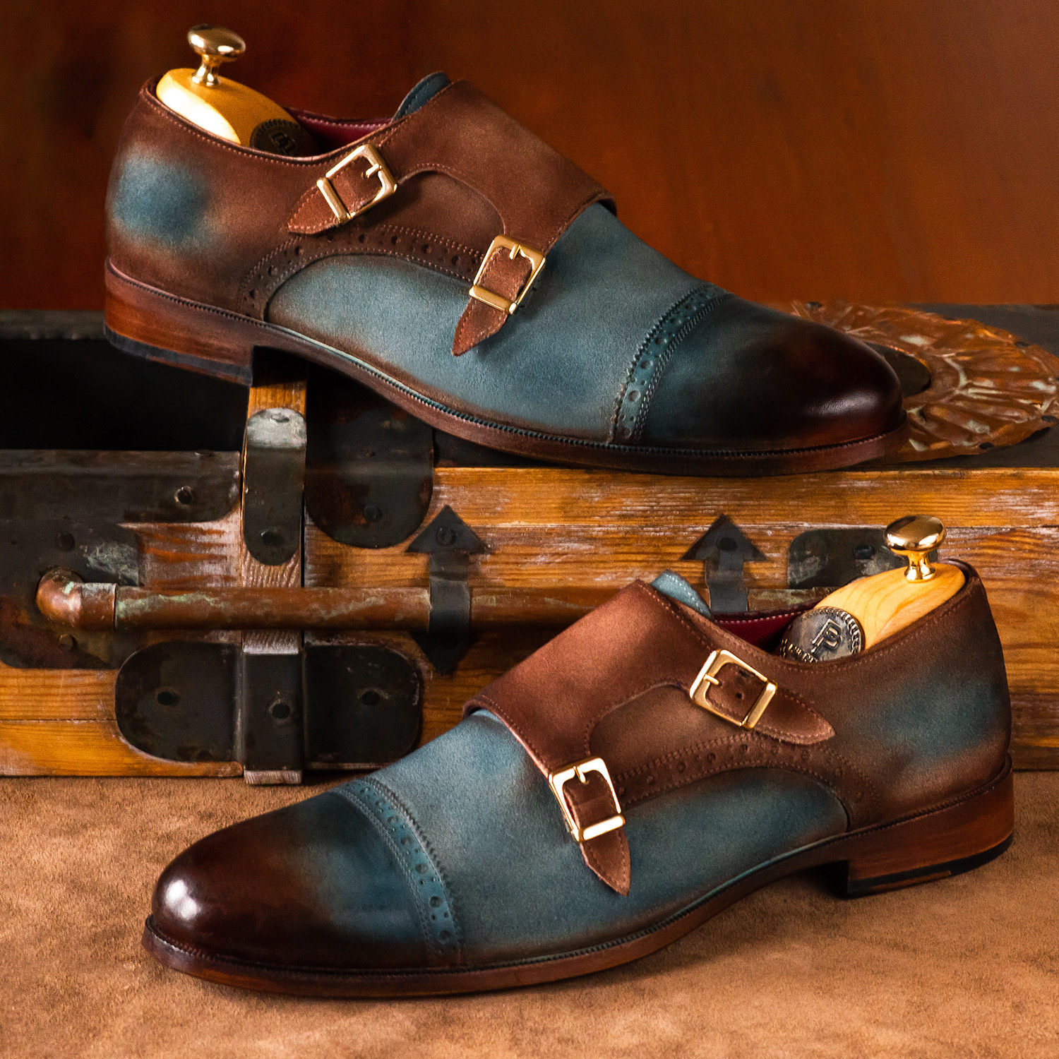 Paul Parkman Captoe Double Monkstrap Antique Blue & Brown Suede