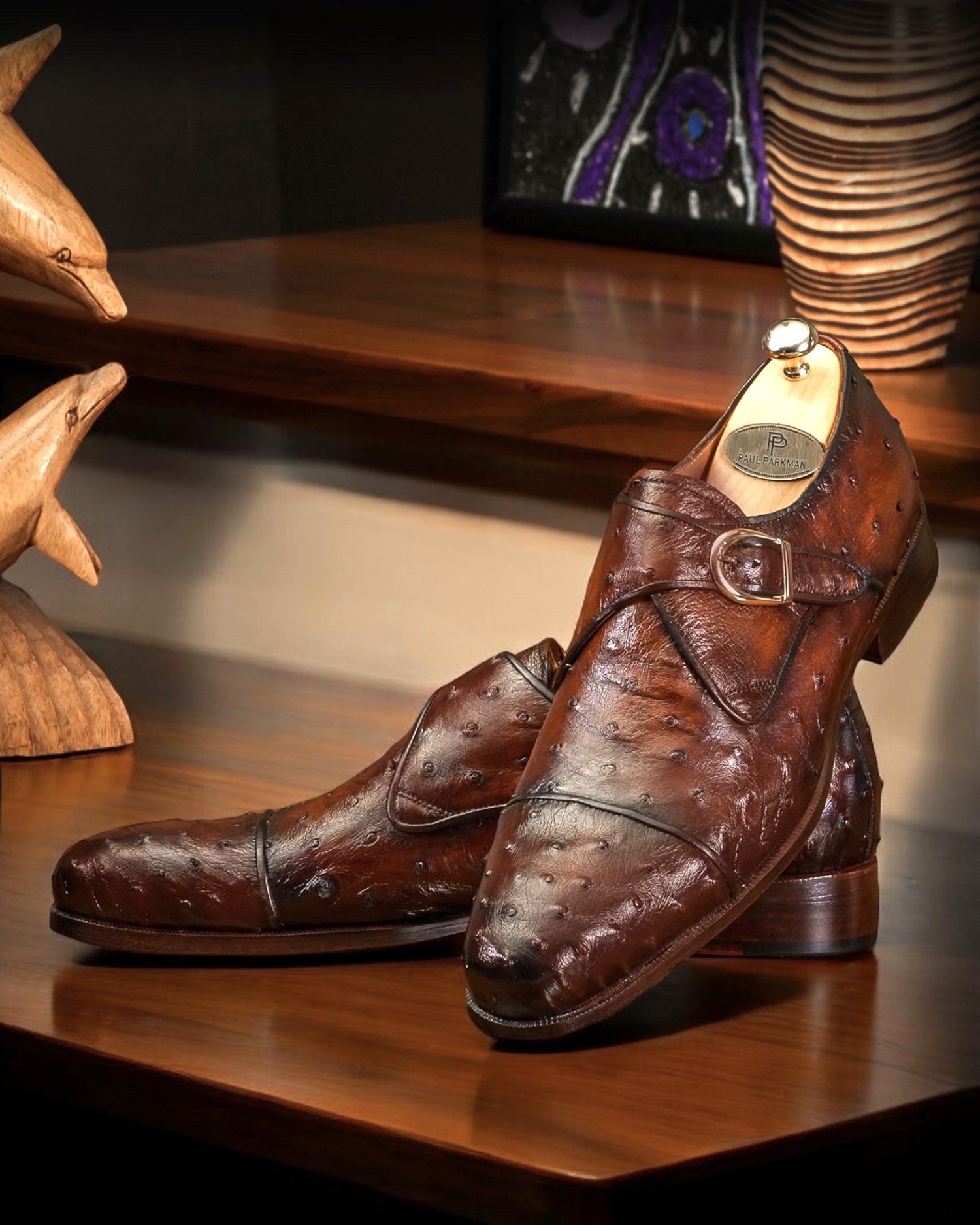 Paul Parkman Men’s Genuine Ostrich Skin Monkstrap Shoes Brown