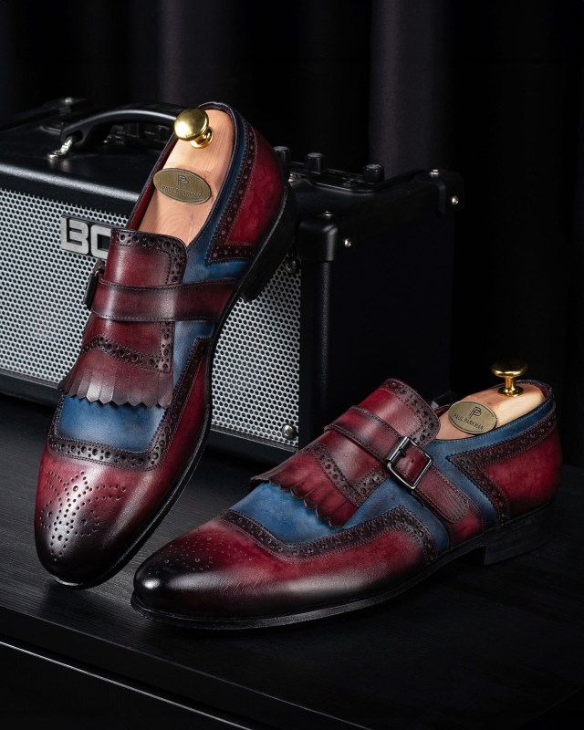 Paul Parkman Men’s Kiltie Monkstrap Shoes Blue & Burgundy Leather