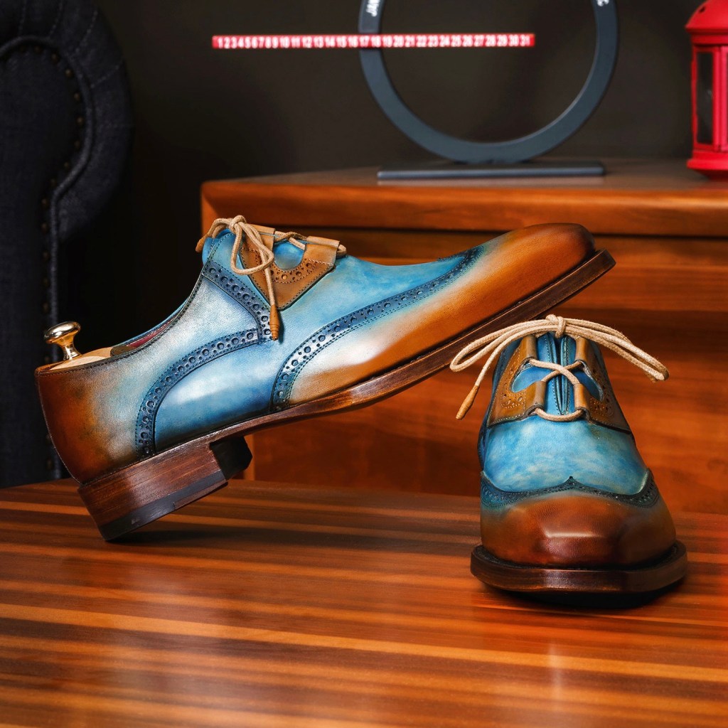 Paul Parkman Turquoise & Tobacco Patina Goodyear Welted Ghillie Lacing Wingtip Brogues