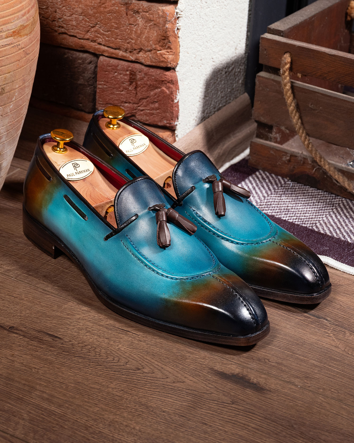 Paul Parkman Men’s Split Toe Tassel Loafers Blue Patina Leather