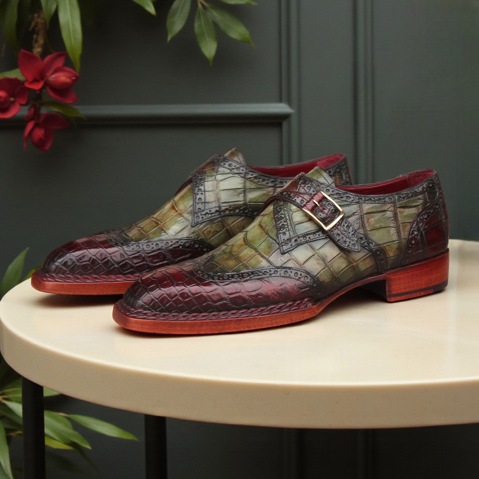 Handcrafted with precision, this single monkstrap shoe showcases Paul Parkman’s mastery in Norwegian hand-welted construction. Made from genuine crocodile skin and finished with a hand-painted Bordeaux and green patina, it represents the highest level of craftsmanship in exotic footwear. Bold and distinctive, this design is for those confident enough to wear a statement piece that reflects true luxury.