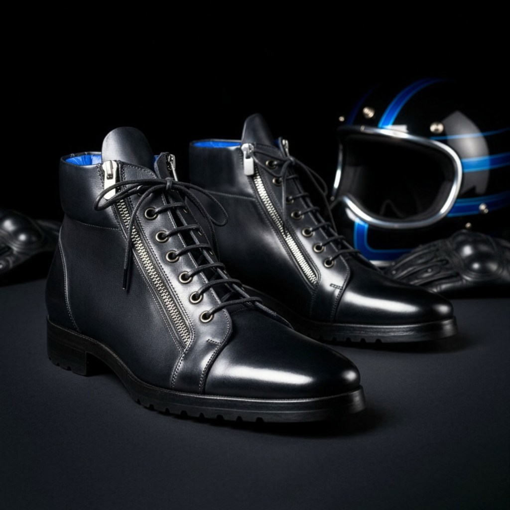 Bold attitude meets refined craftsmanship. The Paul Parkman Black Leather Biker Boots redefine rugged style with a luxurious edge. Crafted from premium calfskin black leather, these boots feature a blue leather lining that adds a refined contrast. Both lace-up and side zipper closures ensure convenience and a distinctive decorative touch. Built on a rubber lug sole for excellent grip and durability, this design combines strength, style, and Paul Parkman’s signature artisanal quality.
