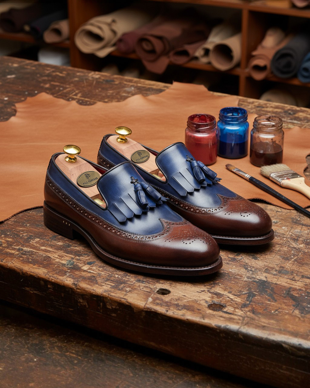 #PaulParkman #MensLuxuryShoes #KiltieLoafers #TasselLoafers #HandPaintedLeather #DualTonePatina #HandcraftedShoes #MasterCraftsmanship