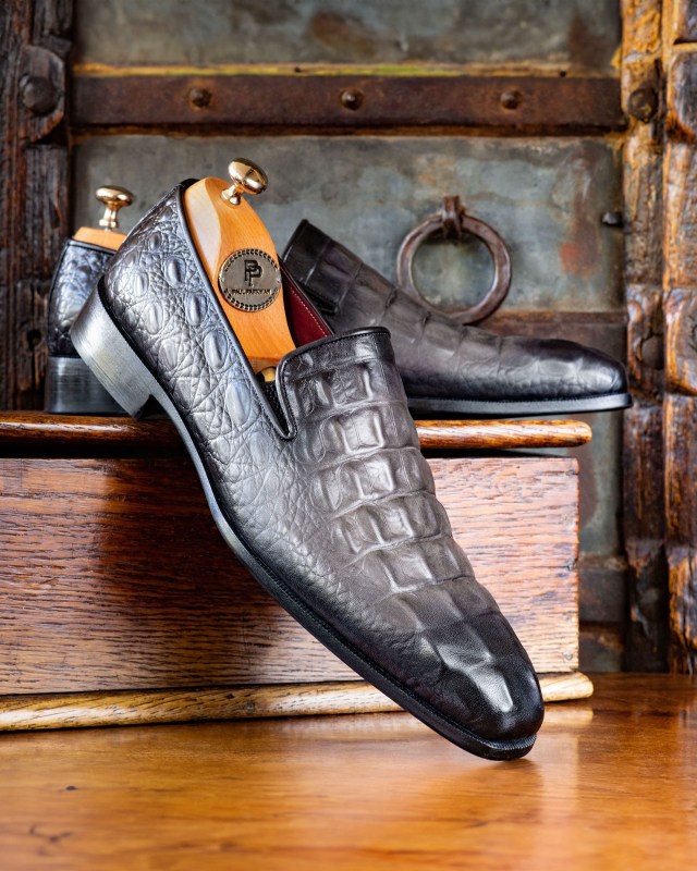 Paul Parkman Gray Crocodile Embossed Calfskin Loafers