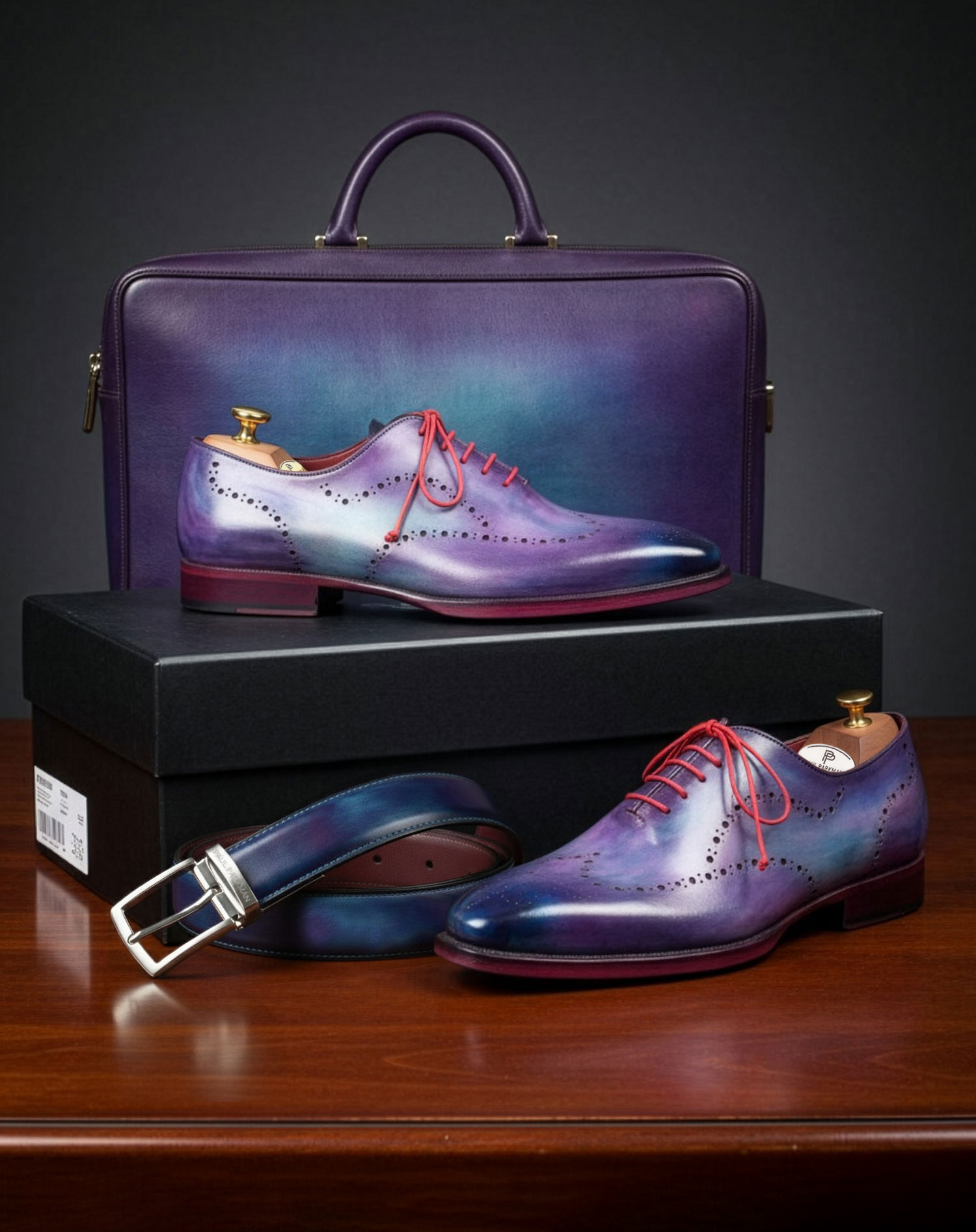 Sky Blue blended with purple — a patina with unmatched character and depth. The design from Paul Parkman features classic wingtip broguing and Goodyear welted construction.